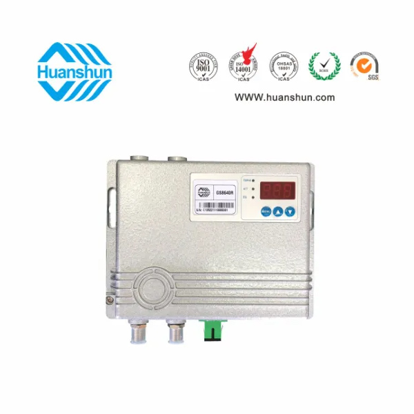 環順GS86/10040R室內光接收機是為適應無源光(PON)入網光纖接入樓道(FTTB)而設計的低功耗光接收裝置。采用高靈敏度光電池,砷化鎵鎘用于低噪聲放大,砷化鎵推挽放大用于末級放大,RF單通道主輸出最大輸出106dBuV或雙2x102dBuV在-7dBm輸出電平。內置EOC插入功能(數據通道5~65MHz)。外置高精度防雷線性電源,LED接收電源元件指示,由于主設備性能優越,加上精心設計的電路,從而保證了高性能和可靠性。